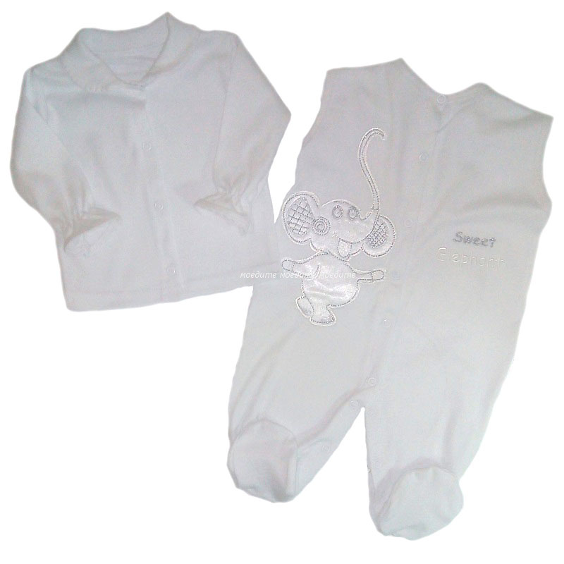 1. Полукомбинезона с закрытыми ножками, спереди и между ножек на кнопочках. Комбинезон украшен спереди и сзади аппликацией в виде слонёнка.